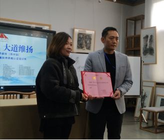 陆乐副院长为王玉锋主任颁发江苏旅游职业学院工艺美术学院客座教授聘书。